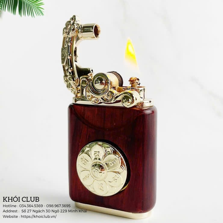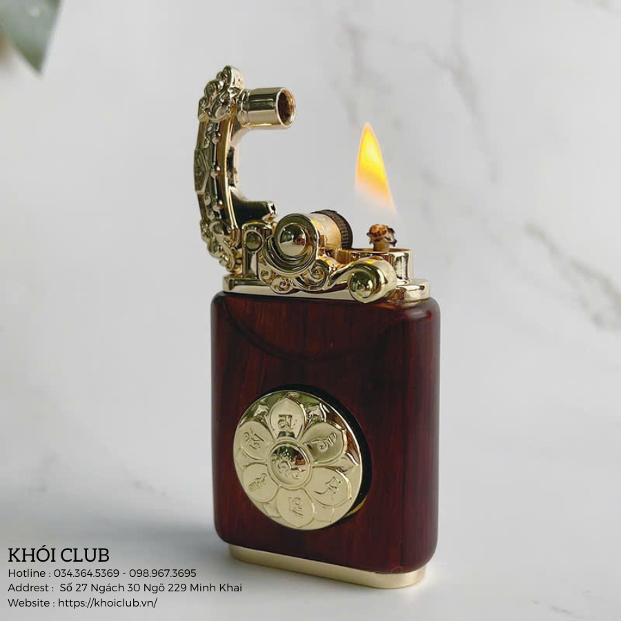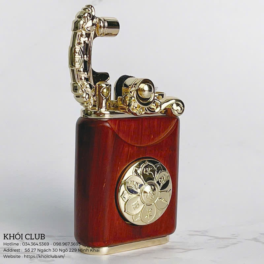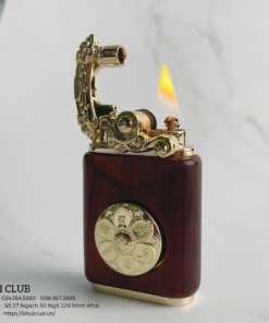 1. Thiết kế Độc Đáo: Bật lửa được chế tác từ chất liệu gỗ cao cấp, mang lại cảm giác ấm áp và tự nhiên. Đặc biệt, phần thân gỗ được trang trí bằng hoa văn kim loại tinh xảo, tạo điểm nhấn nổi bật và phong cách.