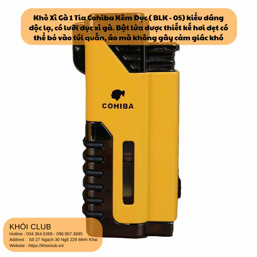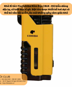 Khò Xì Gà 4 Tia Cohiba Kèm Đục ( BLK – 06) kiểu dáng độc lạ, có lưỡi đục xì gà. Bật lửa được thiết kế hơi dẹt có thể bỏ vào túi quần, áo mà không gây cảm giác khó chịu.