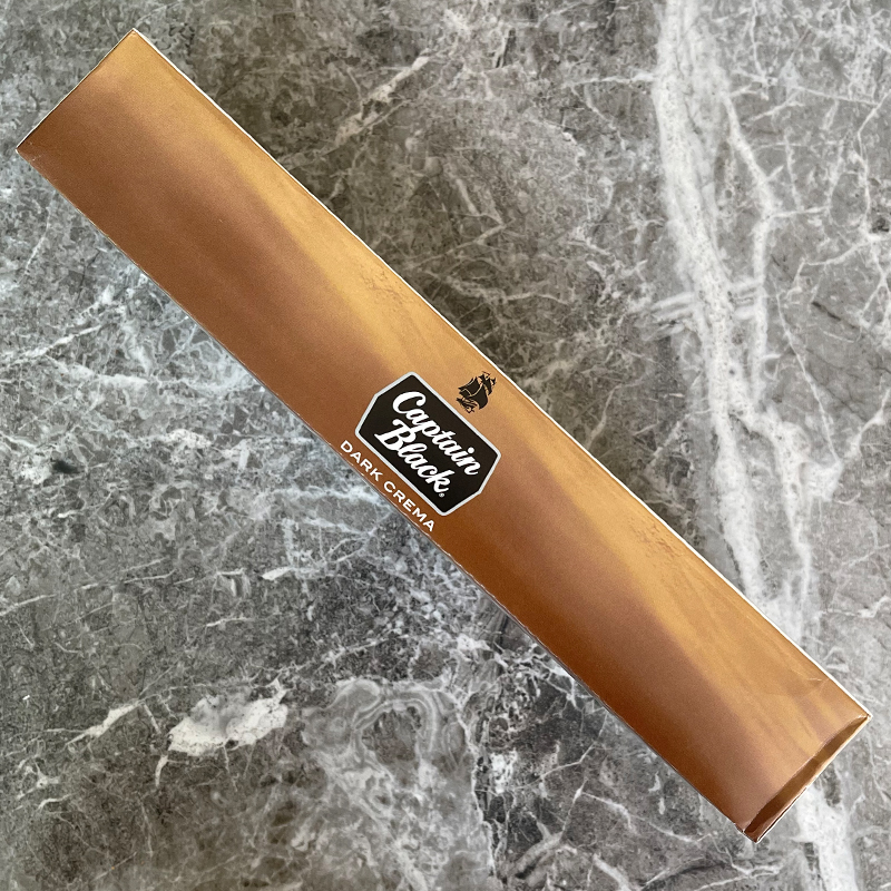 Hộp thuốc Captain Black Dark Crema được thiết kế gọn gàng, sang trọng, dễ dàng mang theo bên mình. Phần giấy cuốn lá thuốc được làm từ chất liệu cao cấp, giúp giữ trọn vẹn hương vị mà không làm ảnh hưởng đến trải nghiệm hút thuốc.