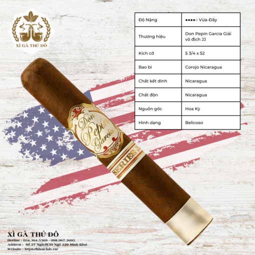 Cigar Don Pepin Garcia Serie JJ là một sản phẩm tinh tế và cao cấp đến từ thương hiệu nổi tiếng Don Pepin Garcia – một cái tên quen thuộc trong thế giới cigar thủ công của Cuba và Nicaragua. Được chế tác với tay nghề tinh xảo, Serie JJ mang đến cho người thưởng thức trải nghiệm độc đáo, đầy ấn tượng với hương vị mạnh mẽ, quyến rũ và trọn vẹn.