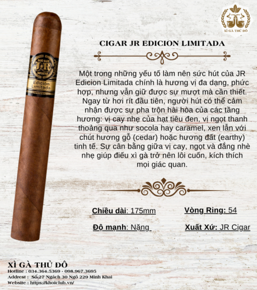 JR Edicion Limitada là dòng xì gà (cigar) phiên bản giới hạn, được đánh giá cao bởi sự cân bằng tuyệt vời giữa chất lượng lá thuốc, hương vị và tính thủ công tinh xảo. Mỗi điếu xì gà đều trải qua quy trình tuyển chọn nghiêm ngặt từ những cánh đồng trồng lá thuốc lâu đời, nơi khí hậu và thổ nhưỡng lý tưởng cho sự phát triển của lá thuốc chất lượng cao. Dòng Edicion Limitada thường được giới sành xì gà đón nhận bởi nét độc đáo, hiếm có, và mang dấu ấn riêng không lẫn vào đâu được.