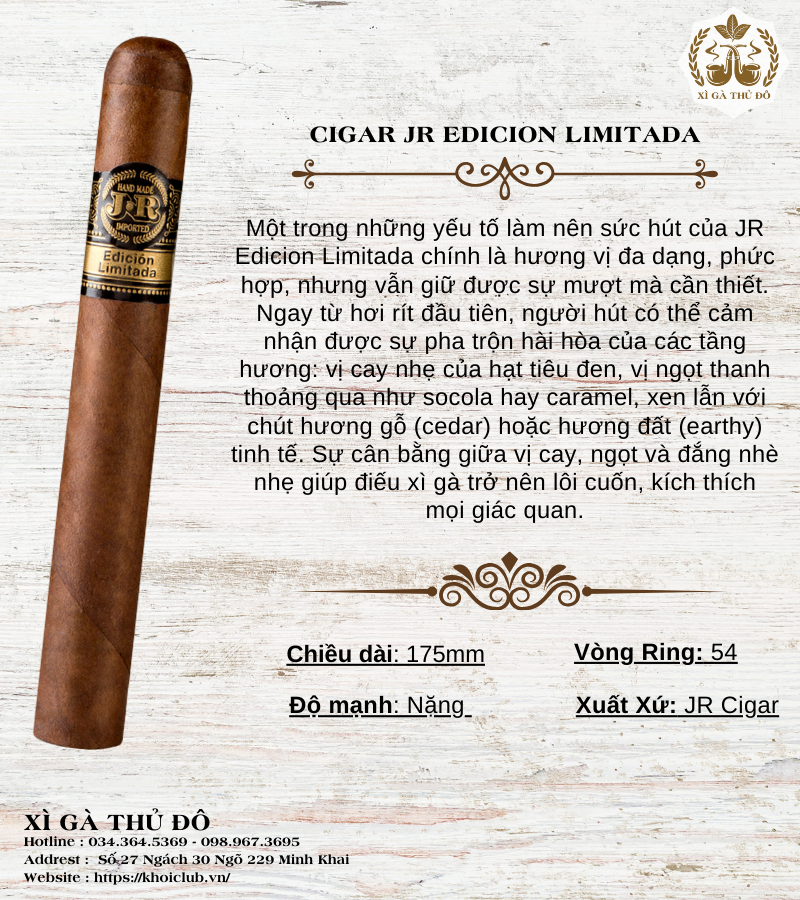 Tóm lại, JR Edicion Limitada không chỉ là một dòng xì gà giới hạn về số lượng, mà còn mang đến giá trị độc đáo về hương vị, chất lượng và đẳng cấp. Từ nguồn gốc lá thuốc được tuyển chọn khắt khe đến quy trình sản xuất thủ công tinh xảo, mọi chi tiết đều được chăm chút để mang lại cho người yêu xì gà một trải nghiệm khó quên. Bằng cách bảo quản đúng phương pháp và thưởng thức một cách tinh tế, bạn sẽ cảm nhận được toàn bộ “tính cách” và chiều sâu mà JR Edicion Limitada muốn truyền tải. Đây xứng đáng là lựa chọn lý tưởng cho những ai đang tìm kiếm một điếu xì gà đẳng cấp, độc đáo và trọn vẹn về mọi mặt.