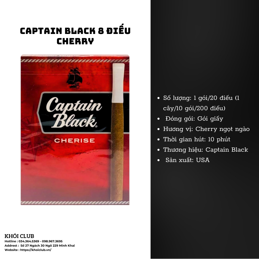- Loại cigar nhỏ gọn, với 8 điếu mang hương vị cherry ngọt ngào, quyến rũ. Đây là sản phẩm được yêu thích từ thương hiệu Captain Black, nổi tiếng với chất lượng cao và hương vị dễ chịu, phù hợp cho người mới hoặc những ai thích sự nhẹ nhàng.