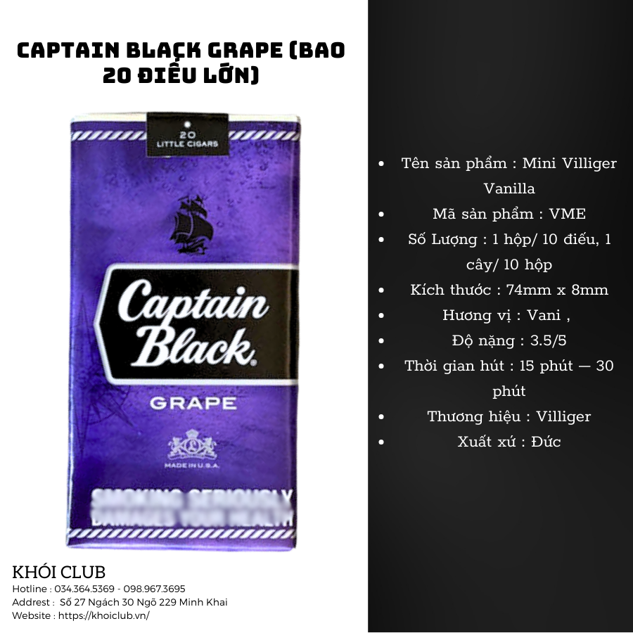 Mô tả sản phẩm: Captain Black Grape là dòng thuốc lá với hương nho độc đáo, mang đến một sự kết hợp giữa vị ngọt ngào của trái cây và hương vị đậm đà của xì gà truyền thống.