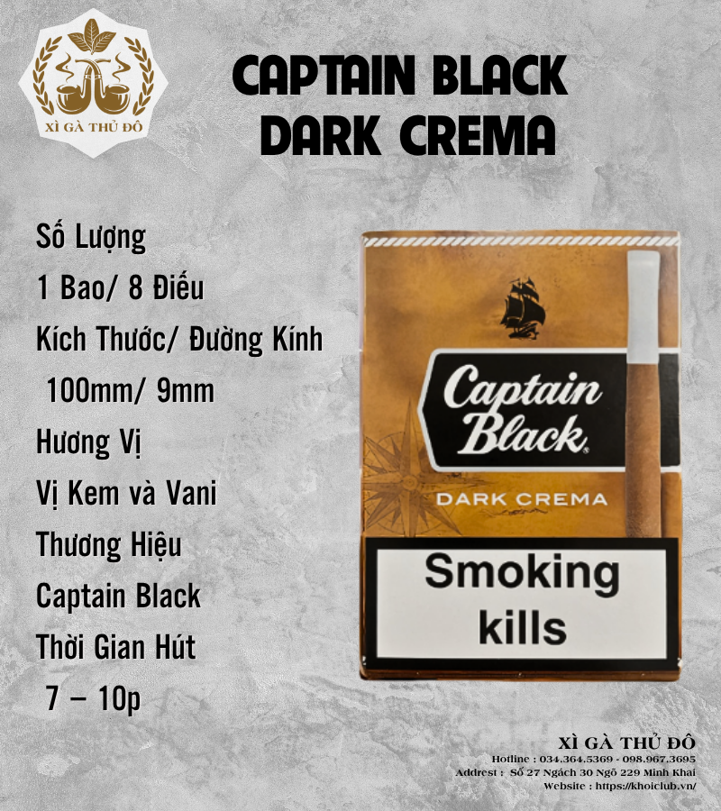 Captain Black Dark Crema (Mỹ): Vị kem và vani ngọt dịu, thời gian hút ngắn 7–10 phút, rất lý tưởng cho những buổi café sáng hoặc thư giãn nhanh trong ngày.