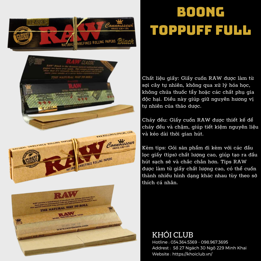 - Chức năng: Sử dụng để cuốn các nguyên liệu thành điếu thuốc. Giấy cuốn RAW nổi tiếng với chất liệu tự nhiên và không chứa hóa chất độc hại.