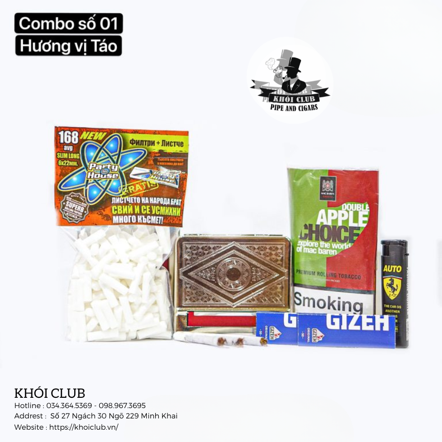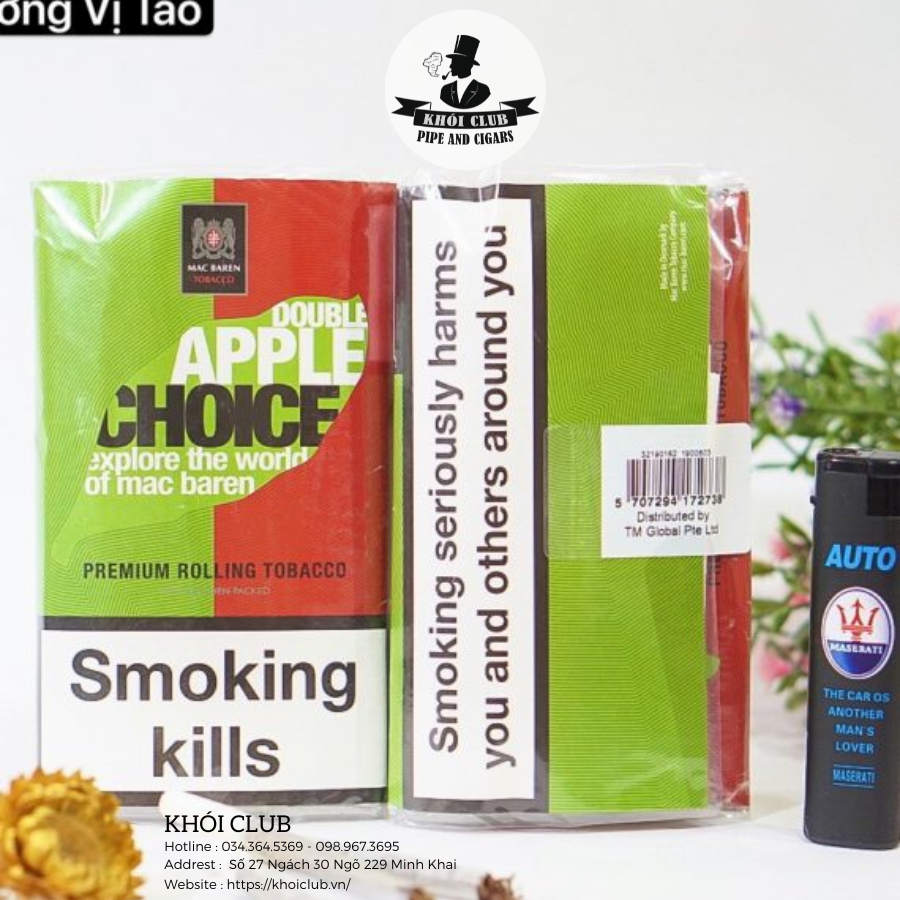 Thuốc lá sợi tự cuốn Mac Baren Double Apple ( Táo ). Thuốc lá sợi cuốn vị Táo hỗn hợp được thực hiện từ viginia nhiên kết hợp với hương vị Táo , hương vị Táo thơm nhẹ nhàng gần giống mùi Táo xanh thơm mát. Tạo nên hương vị rất dễ chịu khi anh em thưởng thức sợi cuốn tại nơi công cộng mà không gây ảnh hưởng đến người xung quanh.