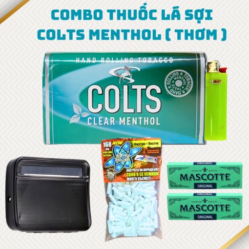 COMBO Thuốc Lá Sợi COLTS Menthol là lựa chọn tuyệt vời cho những ai yêu thích thuốc lá thủ công và mong muốn trải nghiệm hương vị bạc hà tươi mát. Bộ sản phẩm này được thiết kế để mang đến sự tiện lợi và trọn vẹn trong quá trình cuốn và thưởng thức thuốc lá. Dưới đây là các thành phần chi tiết của combo: