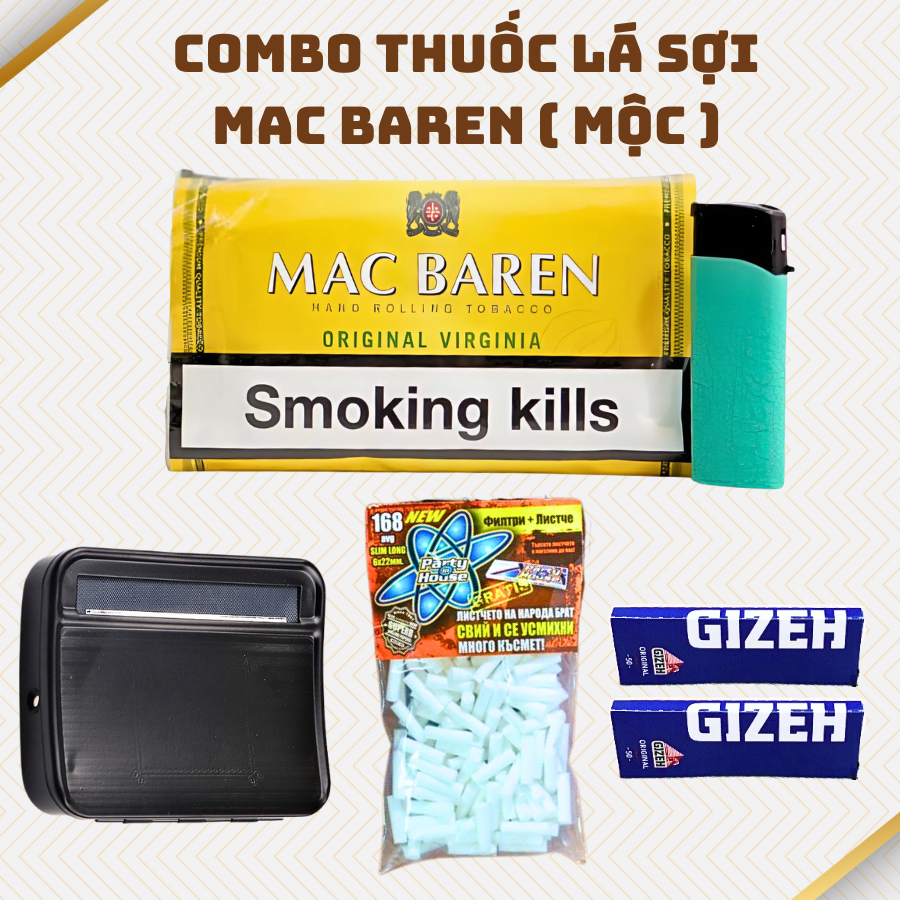 Combo bao gồm một gói thuốc lá sợi Mac Baren Vàng. Một gói thuốc lá sợi Mac Baren Vàng có thể chứa khoảng 40 – 50 gram thuốc lá sợi và các phụ kiện như bộ lọc, giấy cuốn, hoặc các dụng cụ hỗ trợ khác, tùy thuộc vào nhà cung cấp.