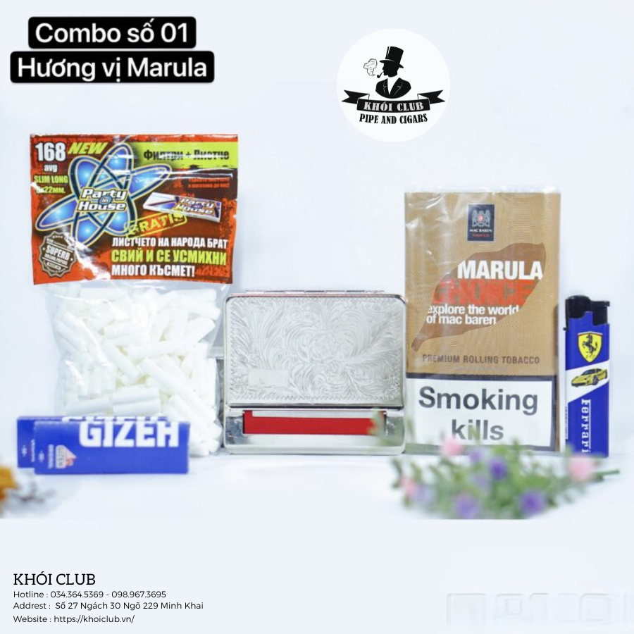 Combo thuốc lá sợi Marula dành cho người mới bắt đầu chuyển sang hút thuốc lá cuốn bao gồm thuốc sợi cuốn và đầy đủ phụ kiện đi kèm theo.