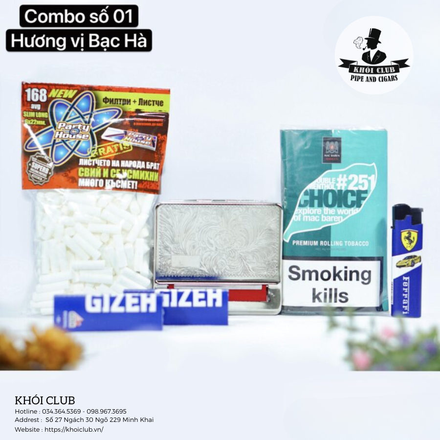 Combo Thuốc Lá Sợi Vị Bạc Hà dành cho người mới bắt đầu chuyển sang hút thuốc lá cuốn bao gồm thuốc sợi cuốn và đầy đủ phụ kiện đi kèm theo.