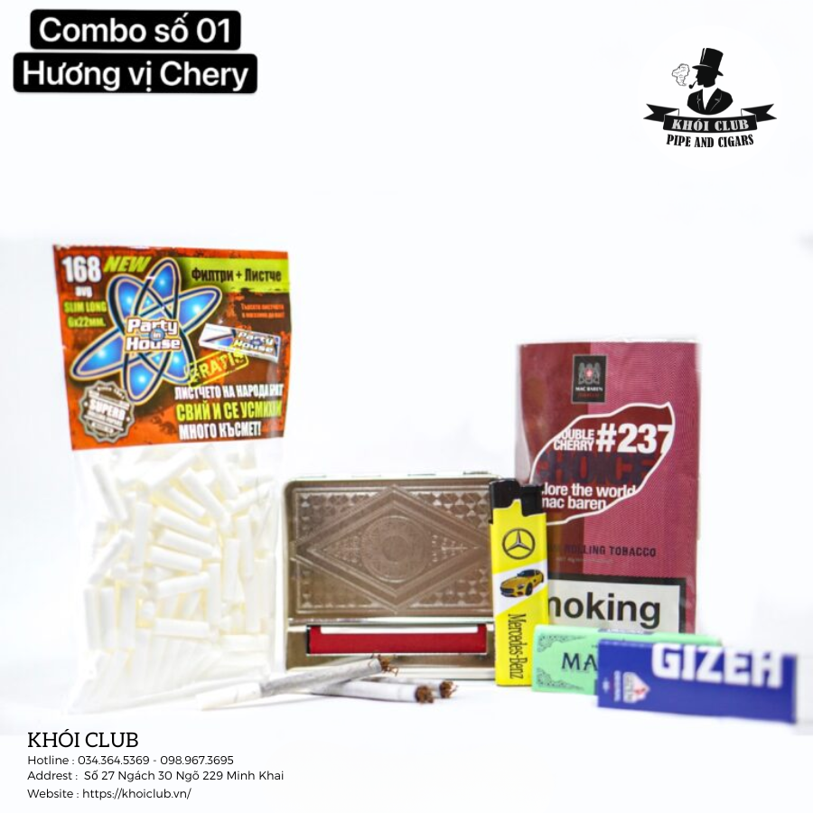Combo Thuốc Lá Sợi Vị Cherry dành cho người mới bắt đầu chuyển sang hút thuốc lá cuốn bao gồm thuốc sợi cuốn và đầy đủ phụ kiện đi kèm theo.