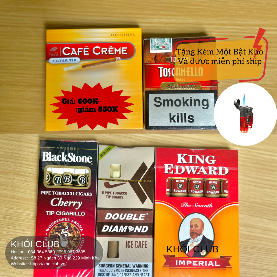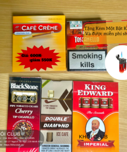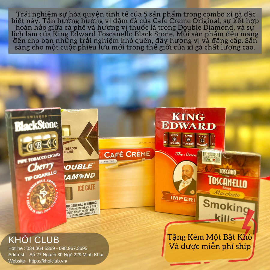 Trải nghiệm sự hòa quyện tinh tế của 5 sản phẩm trong combo xì gà đặc biệt này. Tận hưởng hương vị đậm đà của Cafe Creme Original, sự kết hợp hoàn hảo giữa cà phê và hương vị thuốc lá trong Double Diamond, và sự lịch lãm của King Edward Toscanello Black Stone. Mỗi sản phẩm đều mang đến cho bạn những trải nghiệm khó quên, đầy hương vị và đẳng cấp. Sẵn sàng cho một cuộc phiêu lưu mới trong thế giới của xì gà chất lượng cao.