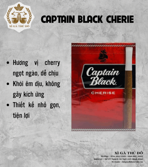 - Captain Black Cherise (Captain Black Cherie): Nổi bật với hương cherry ngọt ngào, dễ chịu, khói êm dịu, không gây kích ứng. Thiết kế nhỏ gọn, tiện lợi cho người dùng.