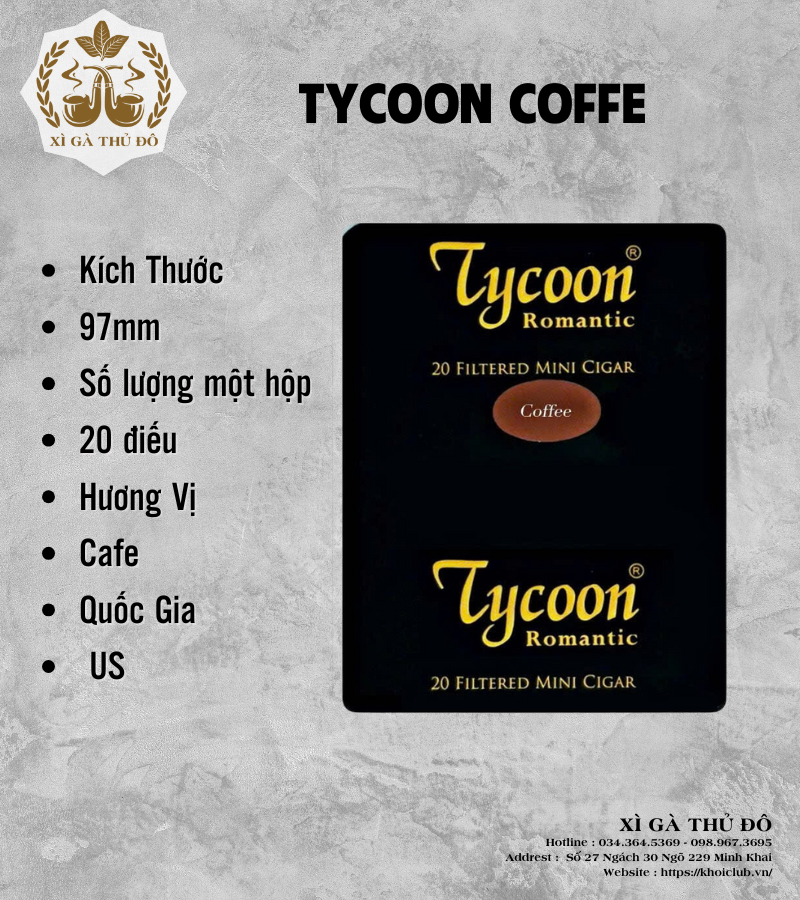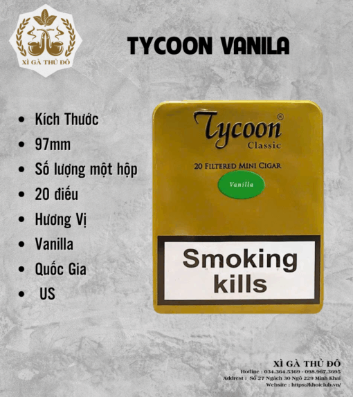 Xì gà mini Tycoon (Xuất xứ: US) nổi tiếng với kích thước đồng nhất khoảng 97mm và được đóng gói tiện lợi 20 điếu/hộp. Dòng Tycoon mang đến các hương vị đậm đà và quen thuộc: