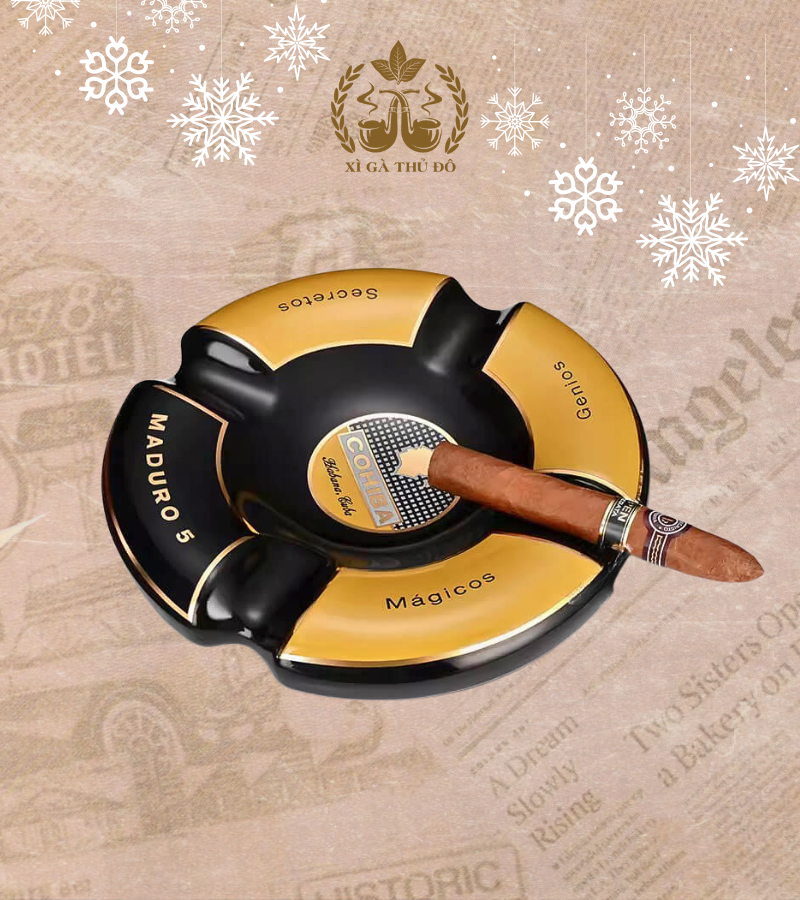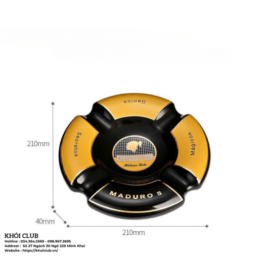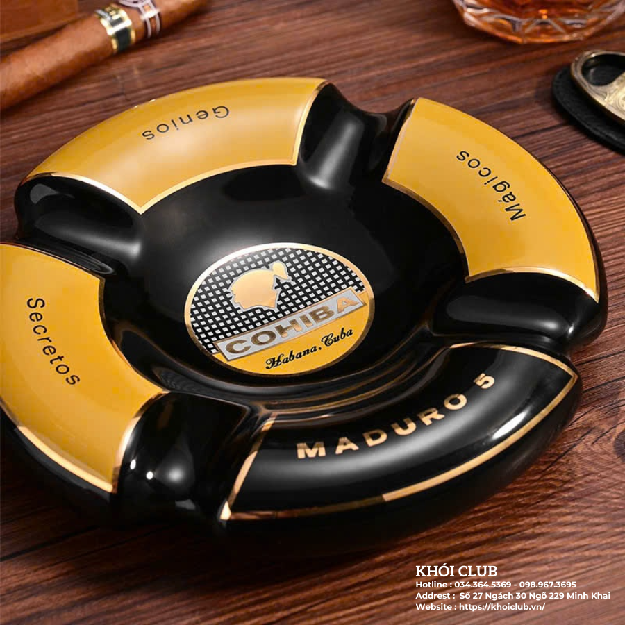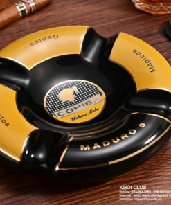 Màu sắc: Gạt tàn Cohiba Maduro thường có màu đen chủ đạo, kết hợp với logo Cohiba Maduro màu vàng hoặc bạc, tạo nên sự tinh tế và nổi bật. Màu đen bóng kết hợp với họa tiết vàng làm tăng vẻ sang trọng và phong cách chuyên nghiệp cho sản phẩm.