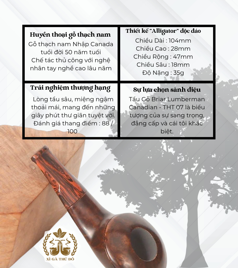 Tẩu Gỗ Briar Lumberman Canadian sở hữu một chiếc tẩu hút thuốc bằng gỗ đá tự nhiên không chỉ là một lựa chọn về chất lượng, mà còn là một tuyên ngôn về phong cách sống. Mỗi đường vân, mỗi chi tiết trên thân tẩu đều mang trong mình câu chuyện của thời gian, của tay nghề thủ công, và của người sử dụng – người biết tận hưởng những giá trị sâu sắc trong cuộc sống hiện đại.