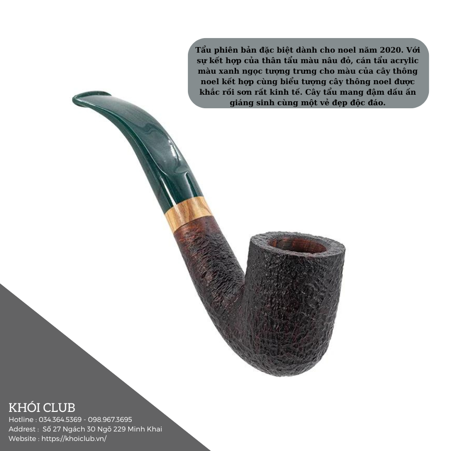 Tẩu phiên bản đặc biệt dành cho noel năm 2020. Với sự kết hợp của thân tẩu màu nâu đỏ, cán tẩu acrylic màu xanh ngọc tượng trưng cho màu của cây thông noel kết hợp cùng biểu tượng cây thông noel được khắc rồi sơn rất kinh tế. Cây tẩu mang đậm dấu ấn giáng sinh cùng một vẻ đẹp độc đáo.