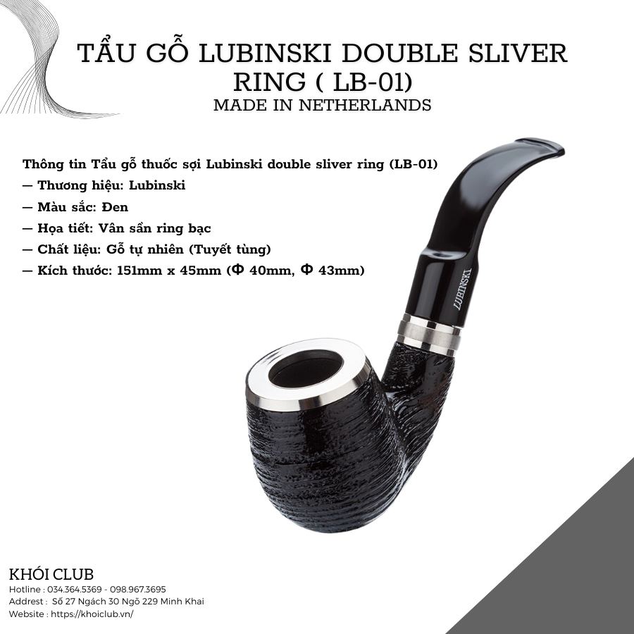 - Tẩu hút thuốc Lubinski LB-Double Silver Ring được làm thủ công bằng gỗ mun cao cấp, chạm khắc logo LUBINSKI, kiểu dáng thời trang, độc đáo, sang trọng.
