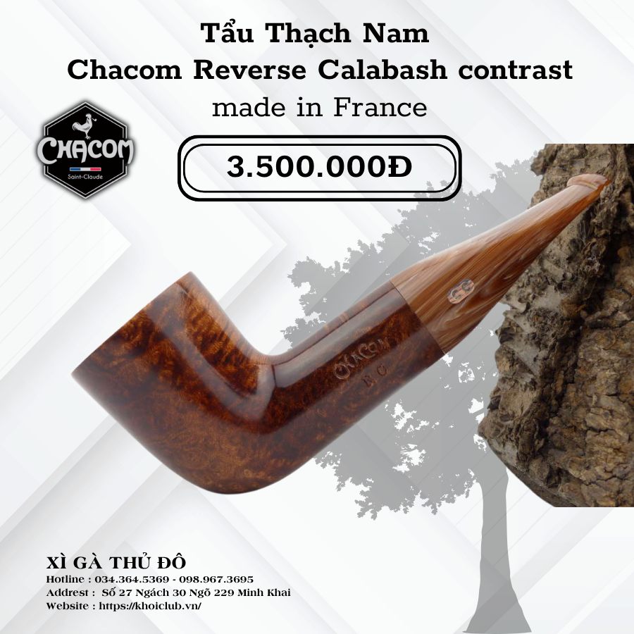 Chacom là thương hiệu tẩu gỗ hàng đầu của Pháp với lịch sử hơn 200 năm, khởi nguồn từ vùng Saint-Claude – nơi được mệnh danh là “cái nôi của ngành chế tác tẩu thủ công thế giới”. Mỗi chiếc tẩu Chacom không chỉ là một dụng cụ hút mà còn là hiện thân của nghệ thuật chế tác tinh xảo và sự tinh tế Pháp. Dòng Chacom Reverse Calabash Contrast là sản phẩm đại diện cho xu hướng kết hợp giữa thiết kế hiện đại và truyền thống, phục vụ người chơi tẩu khắt khe cả về trải nghiệm hút lẫn thẩm mỹ.