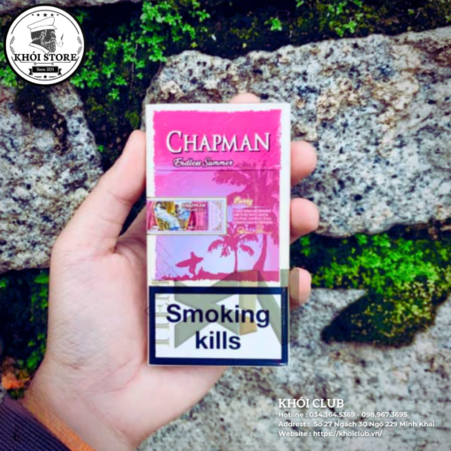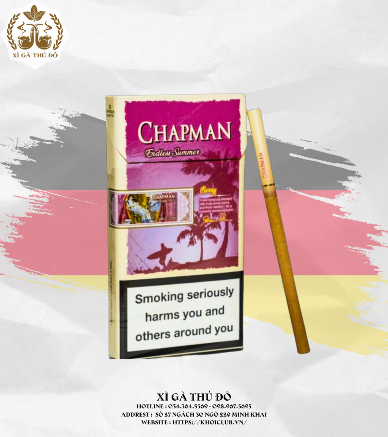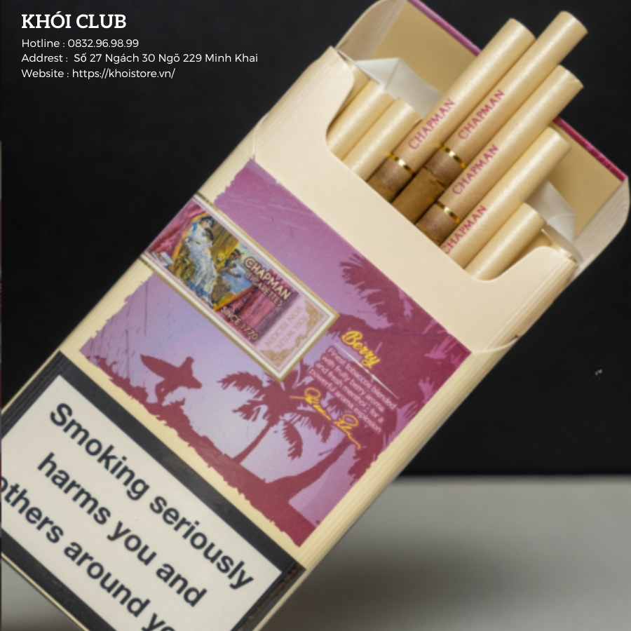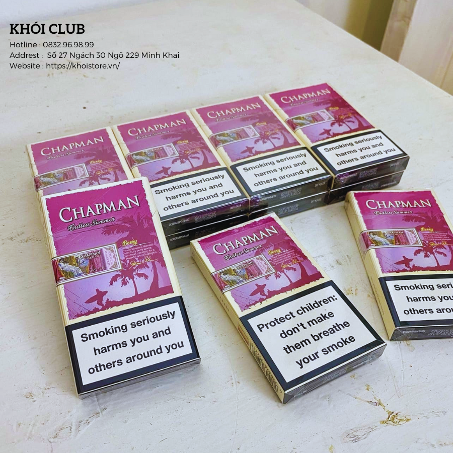 Chapman là một thương hiệu thuốc lá cao cấp nổi tiếng với các dòng sản phẩm có hương vị độc đáo và thiết kế tinh tế. Được lấy cảm hứng từ phong cách cổ điển, mỗi sản phẩm của Chapman không chỉ mang lại trải nghiệm hút thuốc, mà còn khơi gợi cảm giác thưởng thức nghệ thuật và sự thư giãn. Dòng Chapman Berry (Mâm Xôi), thuộc bộ sưu tập “Endless Summer”, nổi bật với sự kết hợp giữa hương vị trái cây thơm ngọt và phong cách mùa hè nhiệt đới, hướng đến những người yêu thích sự nhẹ nhàng, sảng khoái và mới mẻ.