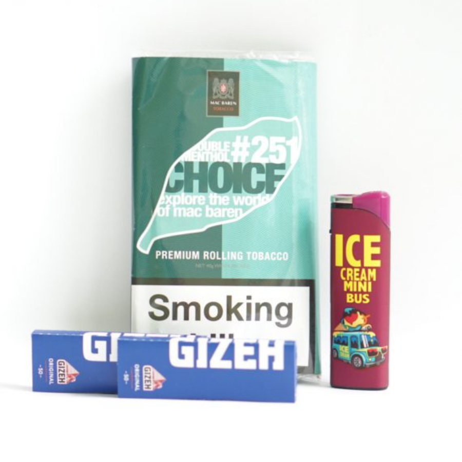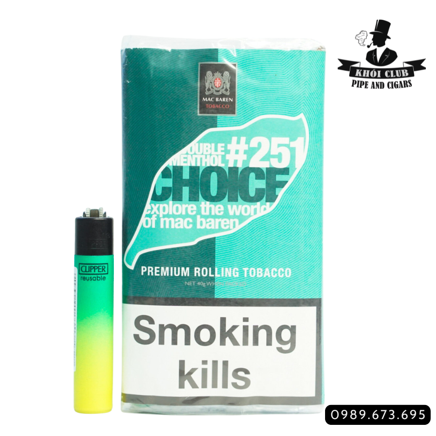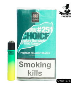 Thuốc lá cuốn tay Mac Baren Choice Double Menthol #251 dãng Silk sởi cất Virginia, Burley và Orient tobaccos với hương vị tươi mát của bạc hà. Tất cả các hỗn hợp trong lựa chọn thuốc lá cuốn tay riêng này của bạn được làm bằng thuốc lá cao cấp. Virginias từ các lĩnh vực thuốc lá hàng đầu ở Mỹ Latinh, Burley nổi bật từ Châu Phi được trộn nhẹ nhàng với thuốc lá cay cay từ Đông Nam Âu. Các thuốc lá của loại này đã được cắt thành sợi để đảm bảo đốt cháy đêu và dễ dàng cuốn bằng tay hoặc bằng phụ kiện cuốn thuốc lá.