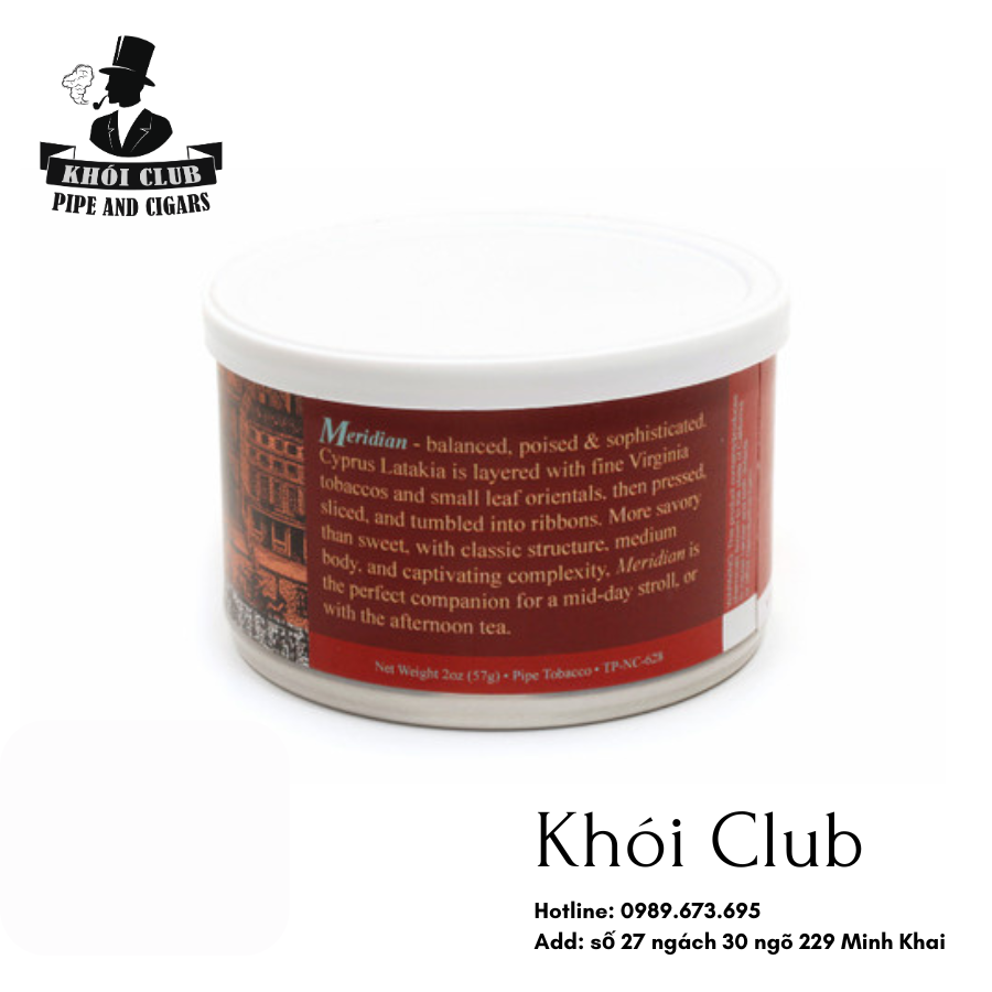 Thuốc hút tẩu G. L. Pease Meridian là hỗn hợp thuốc lá được pha trộn theo công thức riêng với các loại lá Latakia, Virginia và lá Oriental. Sự kết hợp và quá trình này tạo ra loại thuốc hút tẩu thơm ngon theo phong cách cổ điển. Có hương vị đặc trưng nổi bật nhất là mùi khói, hương kem và vị ngọt dịu dàng. Thuốc hút êm nhưng không quá nhẹ, cháy tốt, tàn rất mịn.