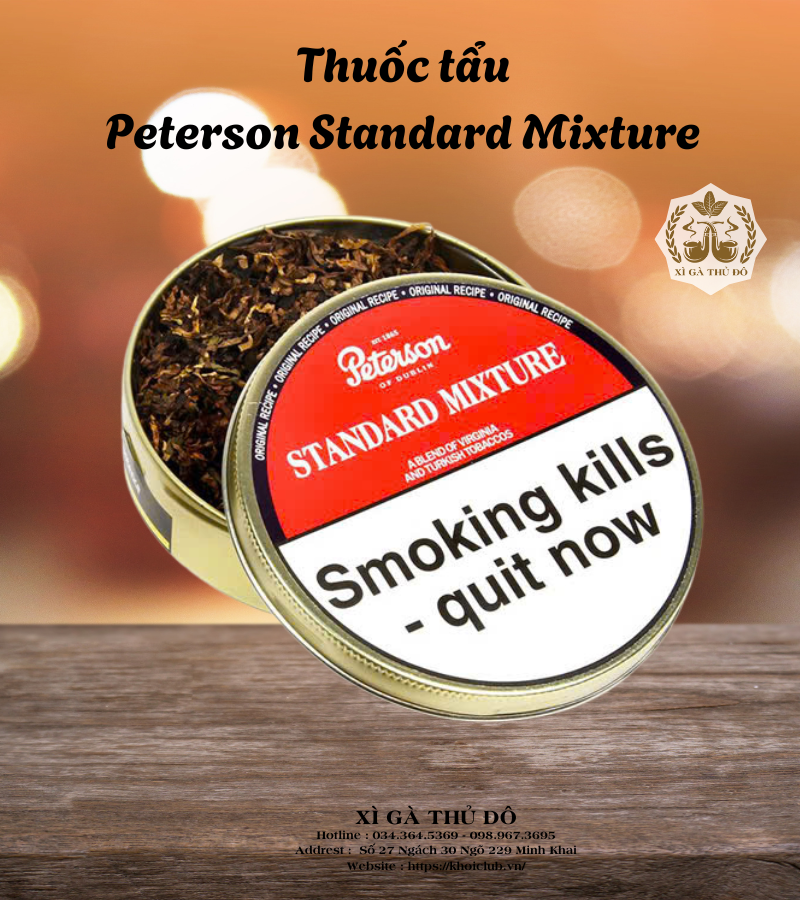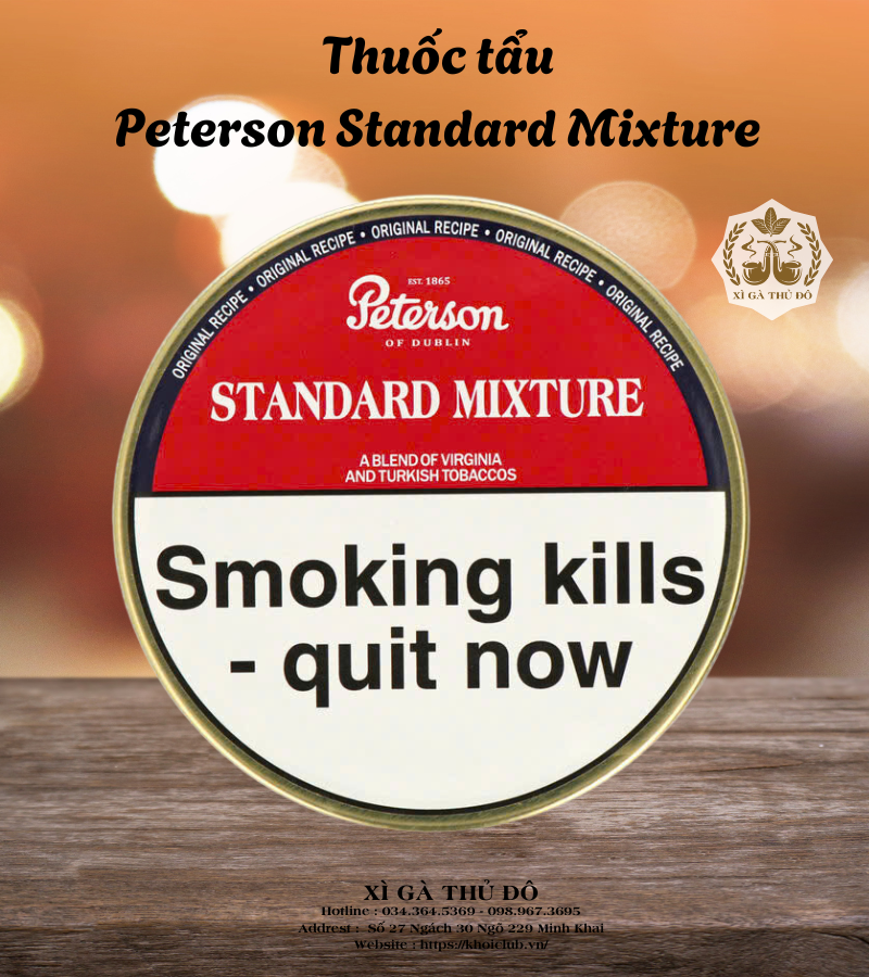 Thuốc tẩu Peterson Standard Mixture là một trong những dòng thuốc tẩu truyền thống tiêu biểu nhất của thương hiệu này. Sản phẩm được pha trộn theo công thức nguyên bản (Original Recipe), vốn được ưa chuộng suốt nhiều thập kỷ bởi những người chơi tẩu yêu thích phong cách Anh cổ điển. Hộp thuốc mang thiết kế đơn giản nhưng đầy nét đặc trưng, với tông đỏ – trắng nổi bật cùng dòng cảnh báo lớn “Smoking kills – quit now”, như một tuyên ngôn thẳng thắn về việc sử dụng sản phẩm có trách nhiệm.