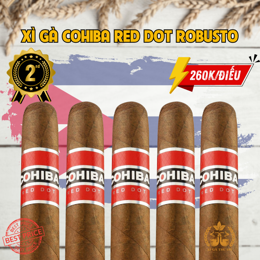 Khác biệt với Cohiba Blue, Cohiba Red Dot Robusto nổi bật với hương vị đậm đà và cay nóng, đem lại cảm giác đầy năng lượng. Sản phẩm này được cuốn tay từ những loại lá xì gà chất lượng cao cấp nhất từ Cộng hòa Dominica, tạo nên phong vị đồng nhất và đầy cuốn hút. Là top 2 trong top 5 Xì Gà Được Yêu Thích Nhất .