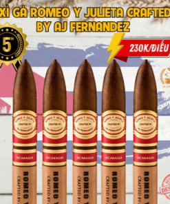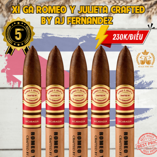 Với phong cách lãng mạn và huyền bí, Romeo y Julieta Crafted by AJ Fernandez mang trong mình hương vị phức tạp từ trái cây khô, gỗ tuyết tùng và cacao. Dòng xì gà này được đánh giá cao bởi những ai yêu thích sự tinh tế và sâu lắng trong từng điếu hút. Là top 5 trong top 5 Xì Gà Được Yêu Thích Nhất .