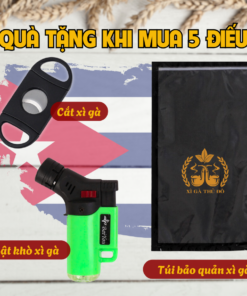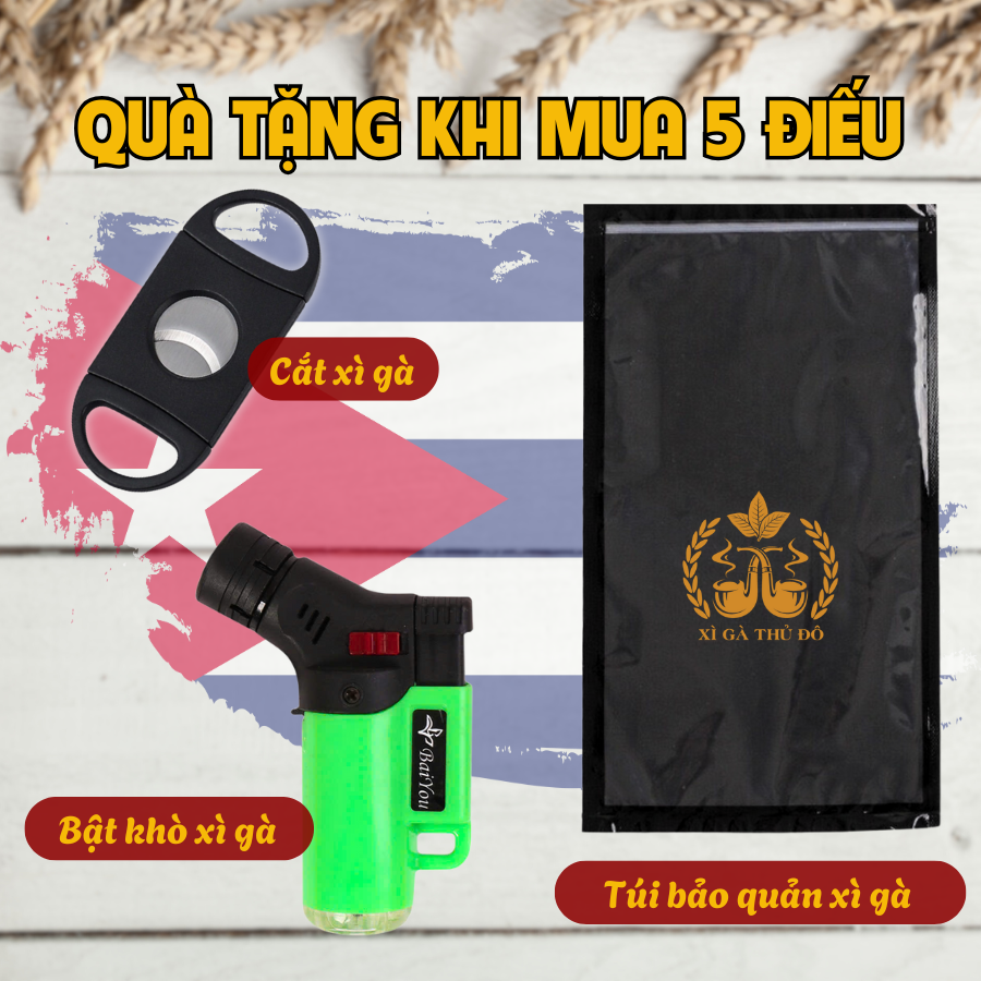 Khi mua 5 điếu xì gà tại Xì Gà Thủ Đô, bạn sẽ nhận ngay bộ quà tặng gồm: dụng cụ cắt xì gà, bật khò xì gà, và túi bảo quản xì gà cao cấp. Đây là cơ hội tuyệt vời để trải nghiệm trọn vẹn đẳng cấp xì gà!