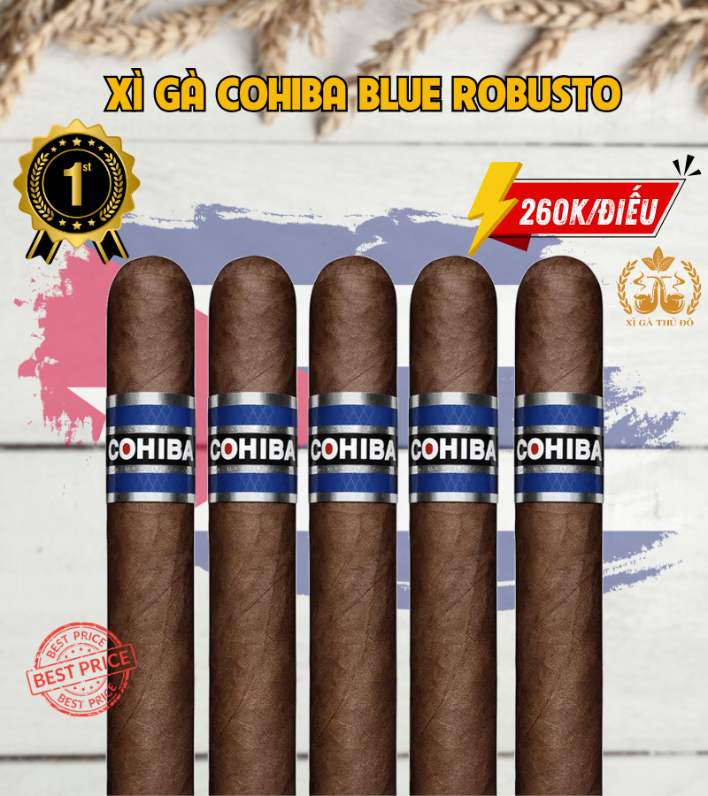 Là biểu tượng của đẳng cấp và sự tinh tế, Cohiba Blue Robusto mang lại một trải nghiệm khó quên với những lớp hương thị ngọt ngào và đậm đà. Dòng xì gà này được sản xuất tại Cộng hòa Dominica với nguyên liệu tốt nhất. Vỏ ngoài màu xanh biểu tượng cho sự mới mẻ và năng động. Là top 1 trong top 5 Xì Gà Được Yêu Thích Nhất