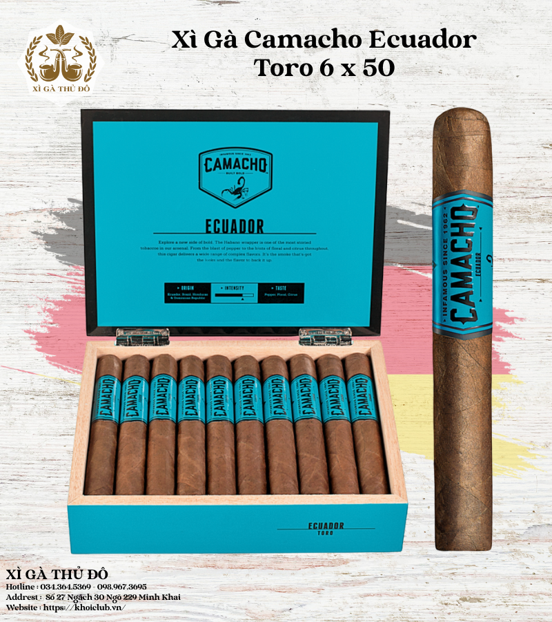 Xì Gà Camacho từ lâu đã được biết đến là một thương hiệu dành cho những người yêu thích sự mạnh mẽ, đậm đà và bứt phá. Trong số các dòng sản phẩm của họ, Xì Gà Camacho Ecuador Toro 6 x 50 nổi lên như một trải nghiệm không thể bỏ qua, nơi sự tinh tế của lá wrapper Ecuador Habano hòa quyện cùng sự dữ dội của filler Honduras và Nicaragua. Bài viết này sẽ đưa bạn đi sâu vào khám phá hương vị, cấu tạo và lý do tại sao điếu xì gà này lại được giới mộ điệu săn đón.