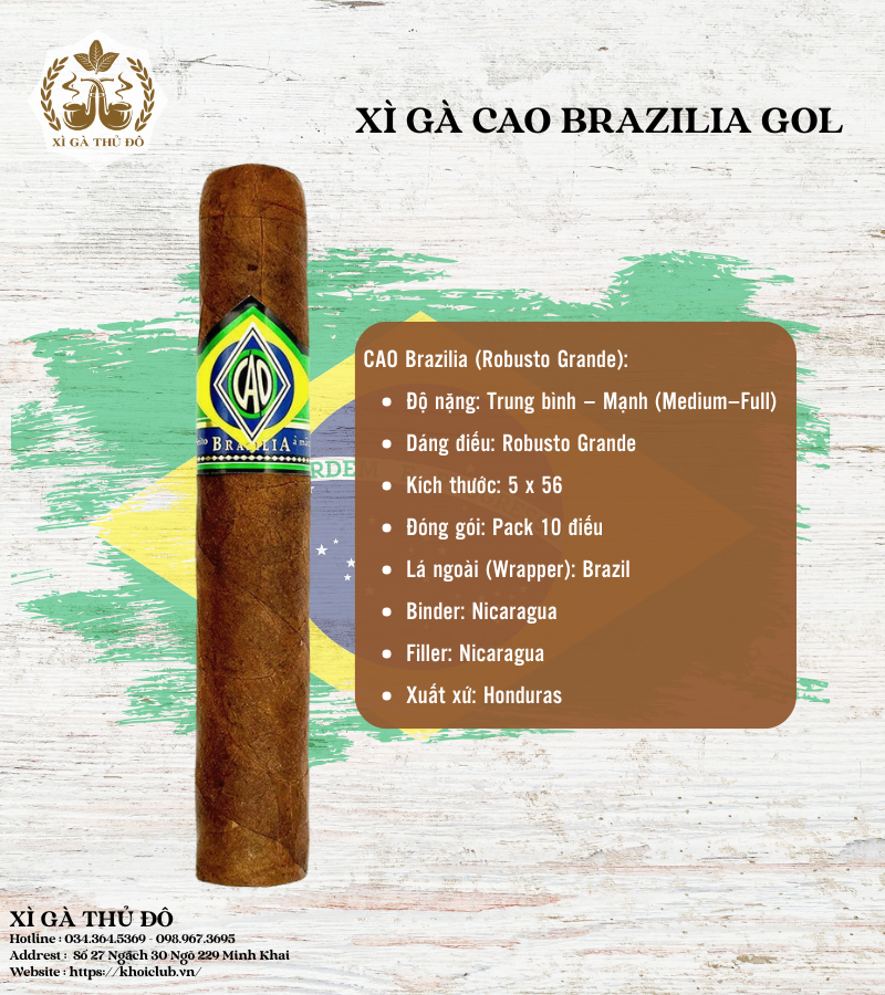 CAO là thương hiệu cigar danh tiếng với phong cách pha trộn độc đáo, thường xuyên sử dụng những loại lá ít phổ biến để tạo dấu ấn riêng. Với Brazilia Gol, CAO lựa chọn lá ngoài Brazil – loại wrapper nổi tiếng bởi độ đậm, màu nâu sẫm và khả năng tạo vị khói mạnh mẽ, cá tính.