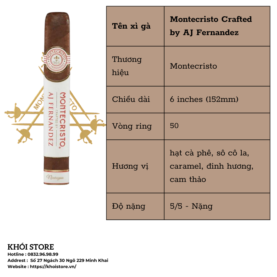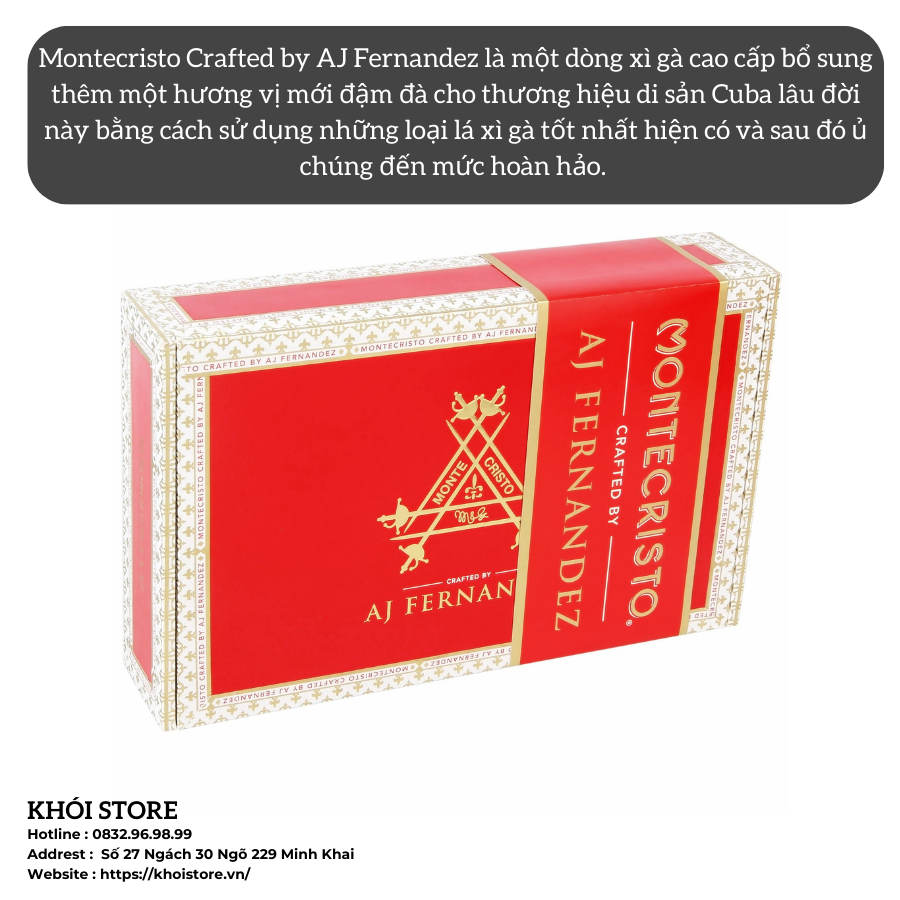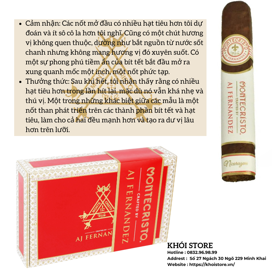 Montecristo là một trong những thương hiệu xì gà lâu đời và dễ nhận biết nhất, đồng thời là tiêu chuẩn vàng về chất lượng xì gà trên toàn thế giới. AJ Fernandez là vua của xì gà tại Nicaragua, đồng thời là người nắm giữ vô số giải thưởng với số điểm 90 trở lên trong xếp hạng xì gà.