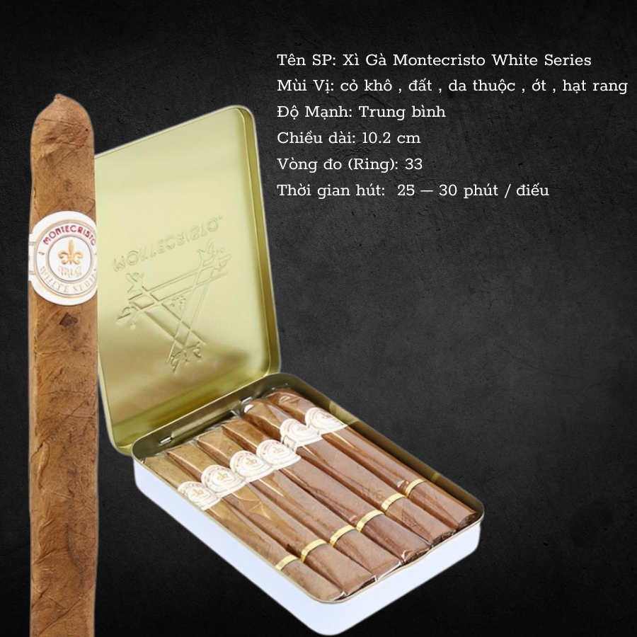 Xì Gà Montecristo White Series có kích thước ngắn, nhỏ gọn, lý tưởng cho những thời điểm mà bạn chỉ có thời gian hút xì gà ngắn ngày hoặc muốn thưởng thức một điếu xì gà nhẹ nhàng trong thời gian ngắn. Bao bọc của Montecristo White Series Prontos Petites được làm từ lá lá mật một cách tinh tế, mang lại cảm giác mềm mại và lịch lãm