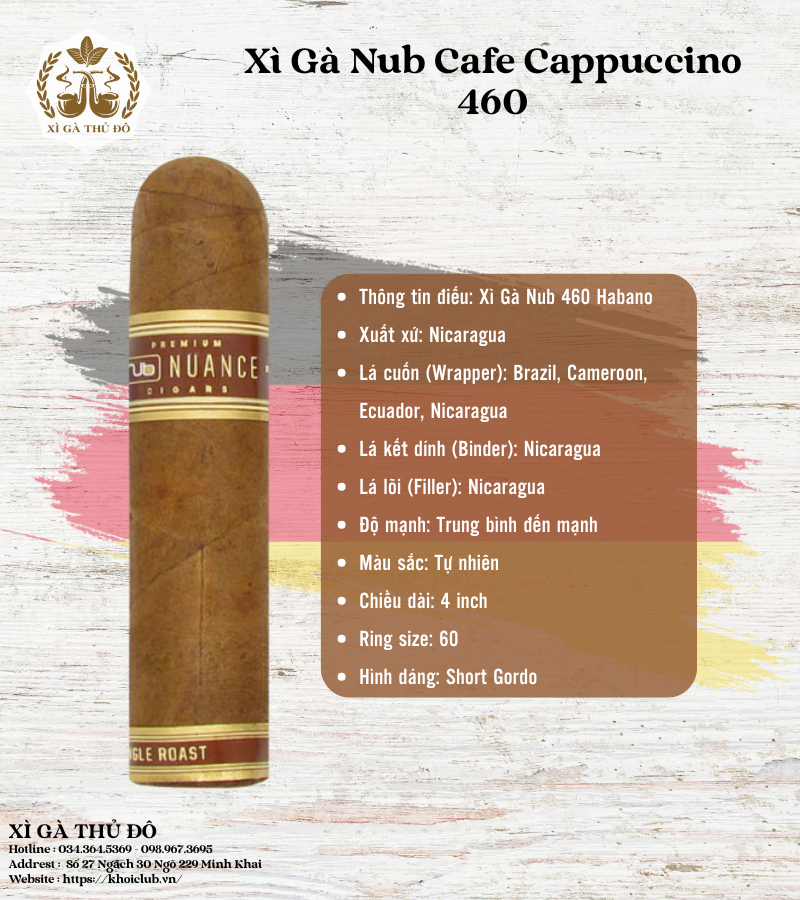 Trong thế giới xì gà có hương vị (Aromatics/Flavored Cigars), Xì Gà Nub Café Cappuccino 460 là một cái tên nổi bật, mang lại trải nghiệm độc đáo, tinh tế và đầy mời gọi. Đây là sự kết hợp tài tình giữa triết lý thiết kế đột phá của Nub và hương vị ấm áp, ngọt ngào của Cappuccino. Với kích thước ngắn, dày (4×60), điếu Xì Gà Nub Café Cappuccino 460 hứa hẹn một làn khói dày đặc, trọn vẹn hương vị cà phê sữa ngay từ những hơi đầu tiên.