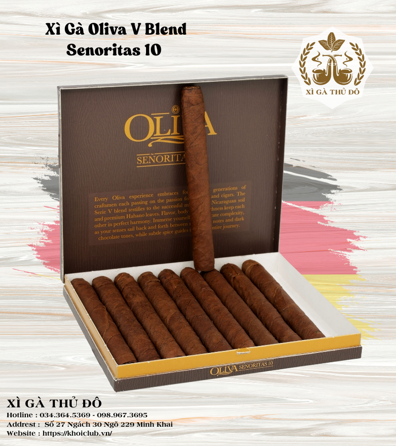 Mặc dù có kích thước nhỏ bé, những điếu Xì Gà Oliva V Blend Senoritas 10 vẫn giữ trọn vẹn tinh thần và cấu trúc hương vị phức tạp làm nên tên tuổi của Serie V. Đây là dòng xì gà được ủ từ những lá thuốc Nicaragua Habano tốt nhất, mang đến sự hòa quyện tuyệt vời của vị cay đậm đà, vị sô cô la ngọt ngào, và hậu vị cà phê tinh tế. Oliva V Blend Senoritas 10 là minh chứng cho thấy sự vĩ đại có thể nằm trọn trong những điều nhỏ bé nhất. Sản phẩm này thường được đóng gói trong hộp 10 điếu tiện dụng, là món quà sang trọng hoặc vật phẩm không thể thiếu trong bộ sưu tập của những người sành sỏi.