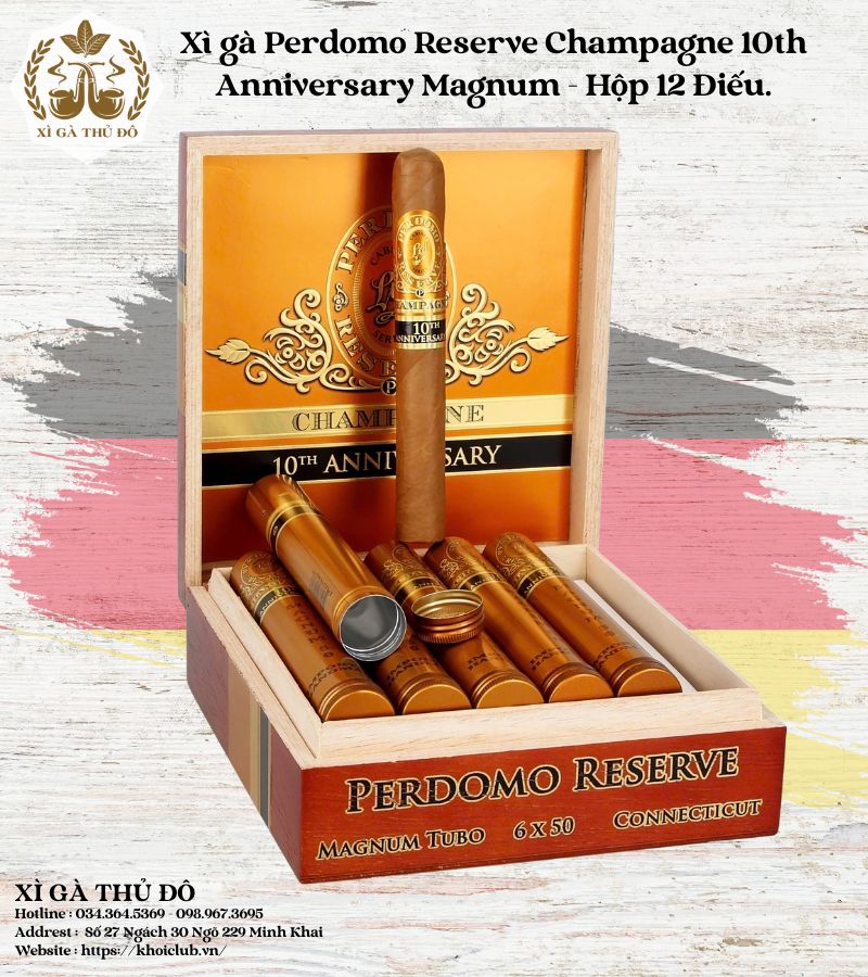 Xì gà Perdomo Reserve Champagne 10th Anniversary Magnum – Hộp 12 Điếu Quy cách: Hộp 12 điếu, mỗi điếu được bảo quản trong Tubo nhôm sang trọng (Magnum Tubo).