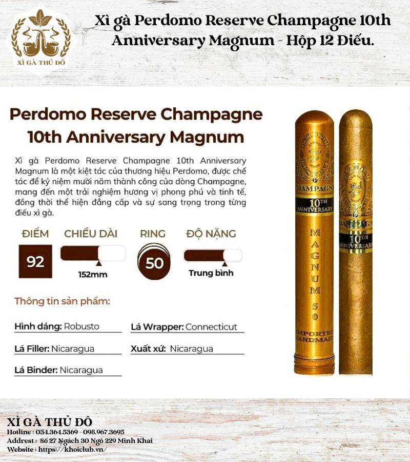 Xì gà Perdomo Reserve Champagne 10th Anniversary Magnum là sự lựa chọn hoàn hảo cho những ai tìm kiếm một điếu xì gà chất lượng cao, hương vị phức hợp nhưng vẫn giữ được sự mượt mà và êm dịu. Hộp 12 điếu Tubo không chỉ là vật phẩm giá trị mà còn là món quà sang trọng cho bất kỳ tín đồ xì gà nào.